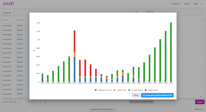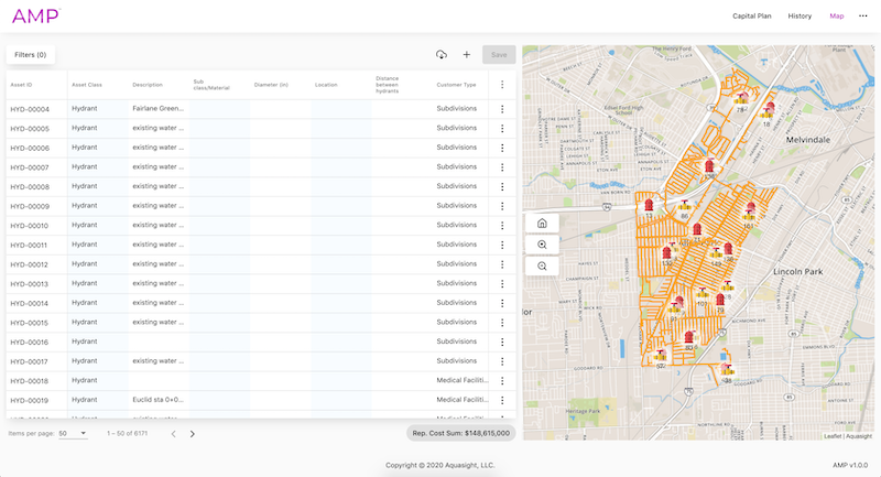 AMP identifies the assets for example sewer mains that most urgently need inspection. As asset conditions change, BRE scores change in near real-time reducing time and effort spent on risk scoring. It track BRE’s up to 25 years ahead based on attribute, condition, and criticality data, AMP will create various R&R scenarios and notifies if there will be capital surplus or shortages.